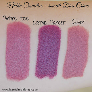 Oggi passiamo ad altre tre tonalità che ho acquistato piuttosto di recente, due di loro fanno parte delle collezioni stagionali che ha lanciato Nabla, nello specifico Cosmic Dancer proviene dalla collezione Artika , mentre Closer è uscito proprio in questi giorni con la collezione estiva Mermaid. Ombre rose invece, fa parte dei colori usciti sin dal lancio dei Diva Crime, ma inizialmente non lo avevo acquistato; come potete notare dalle stick però, mi piace tantissimo, lo uso praticamente tutti i giorni e sta terminando a vista d\’occhio.