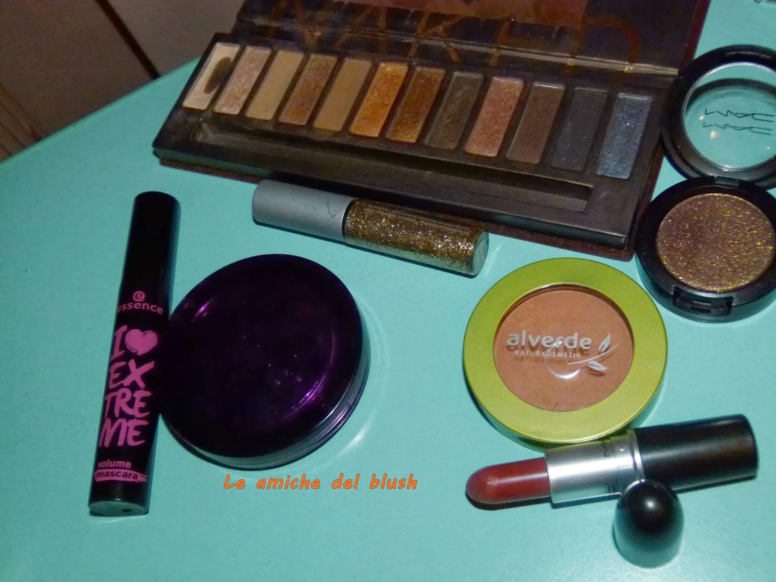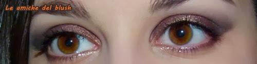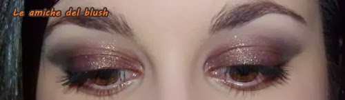 Nella parte inferiore dell\’occhio ho usato sempre Gun metal e poi i glitter in gel di Urband Decay color oro. Come mascara ho usato l\’I love extreme di Essence