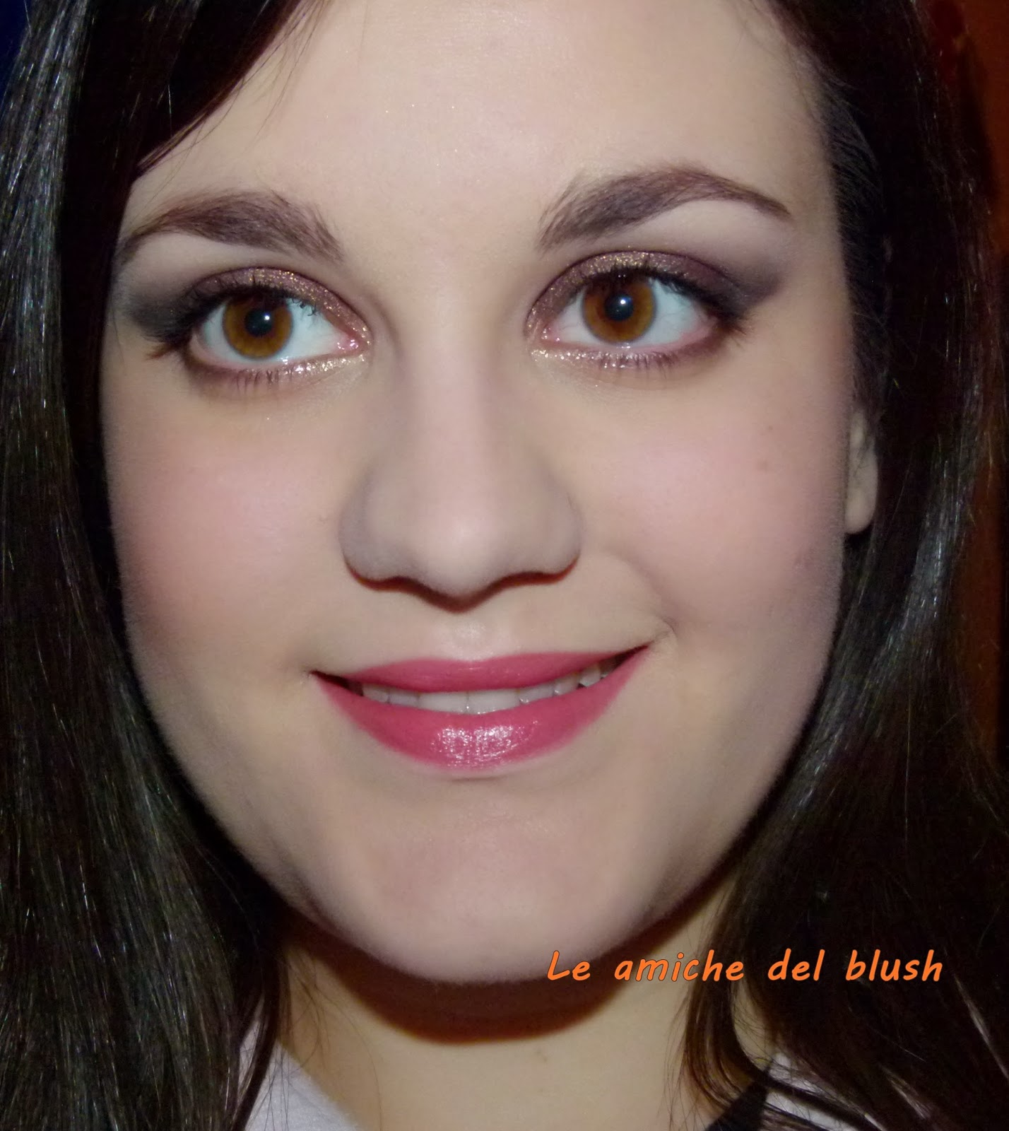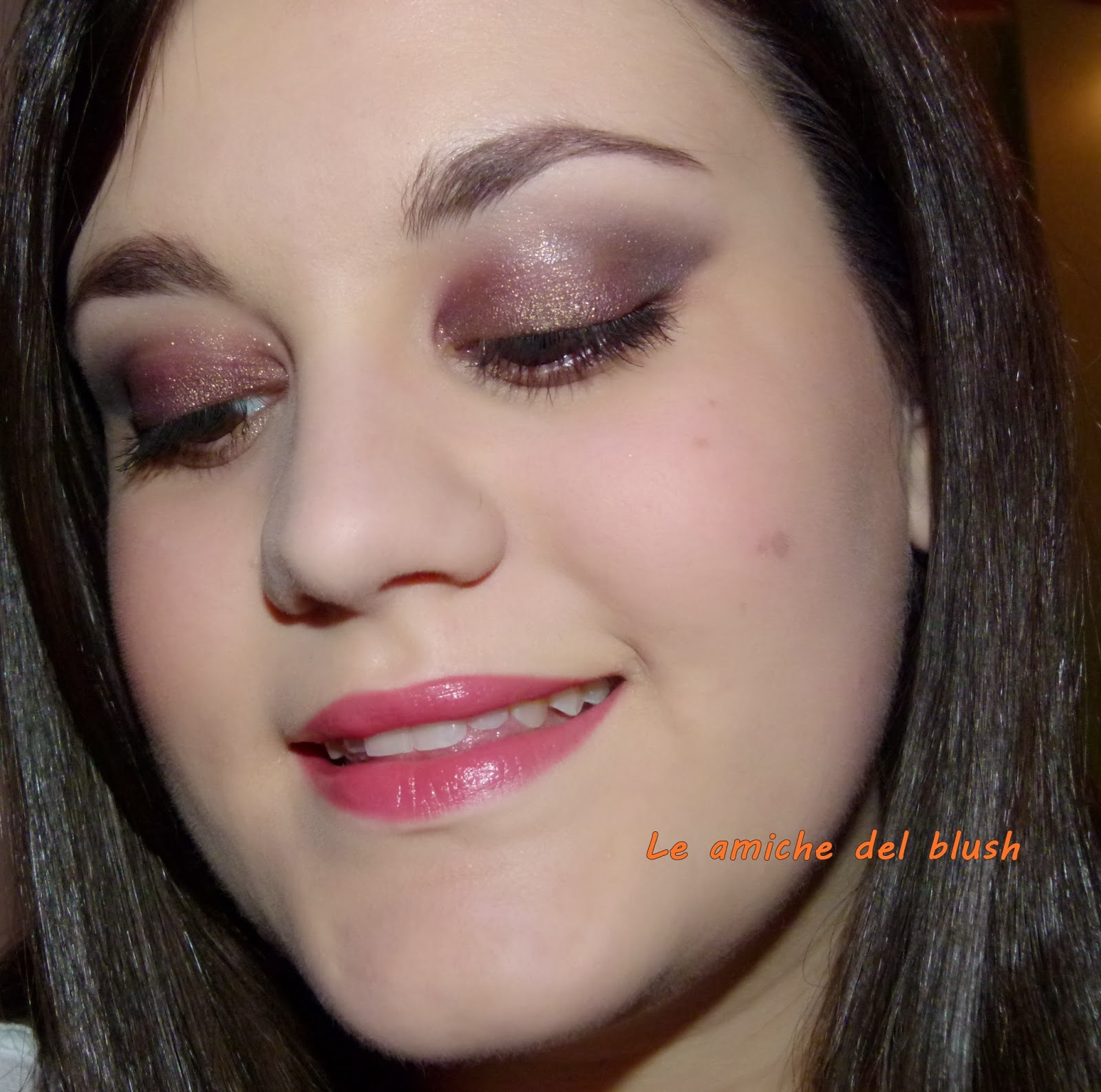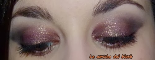 Sugli occhi ho steso il solito primer Urban Decay e poi ho creato la V esterna con l\’ombretto Gun Metal della Naked1. Al centro dell\’occhio ho steso un pigmento pressato di Mac nel colore Damson e l\’ho usato bagnato per aumentare la scrivenza e i riflessi cangianti.