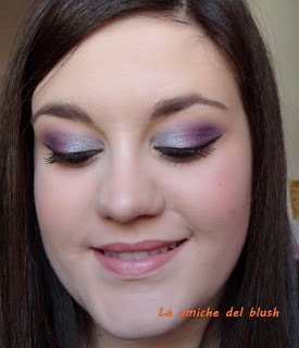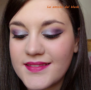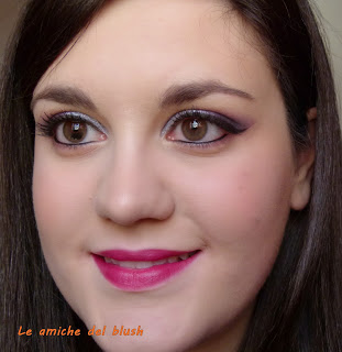 Per realizzare il trucco occhi ho usato come al solito il primer potion Urban Decay e poi nell\’angolo esterno ho steso un viola scurissimo dalla palettina Bad Girl di Sleek, passandoci sopra il viola e il fuchsia della Intensissimi di Neve Cosmetics. Nell\’angolo interno ho usato l\’ombretto in crema Vamp di Pupa num 301, un azzurro/grigio metallizzato. Ho steso una riga di eyeliner usando il lasting drama gel di Maybelline colore nero. Come mascara ho utilizzato il bellissimo Shock di Collistar, fa un effetto da paura! Infine nella rima interna ho usato la matita nera di Marc Jacobs (sample avuto in America).