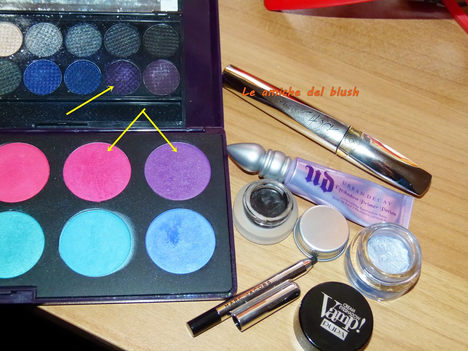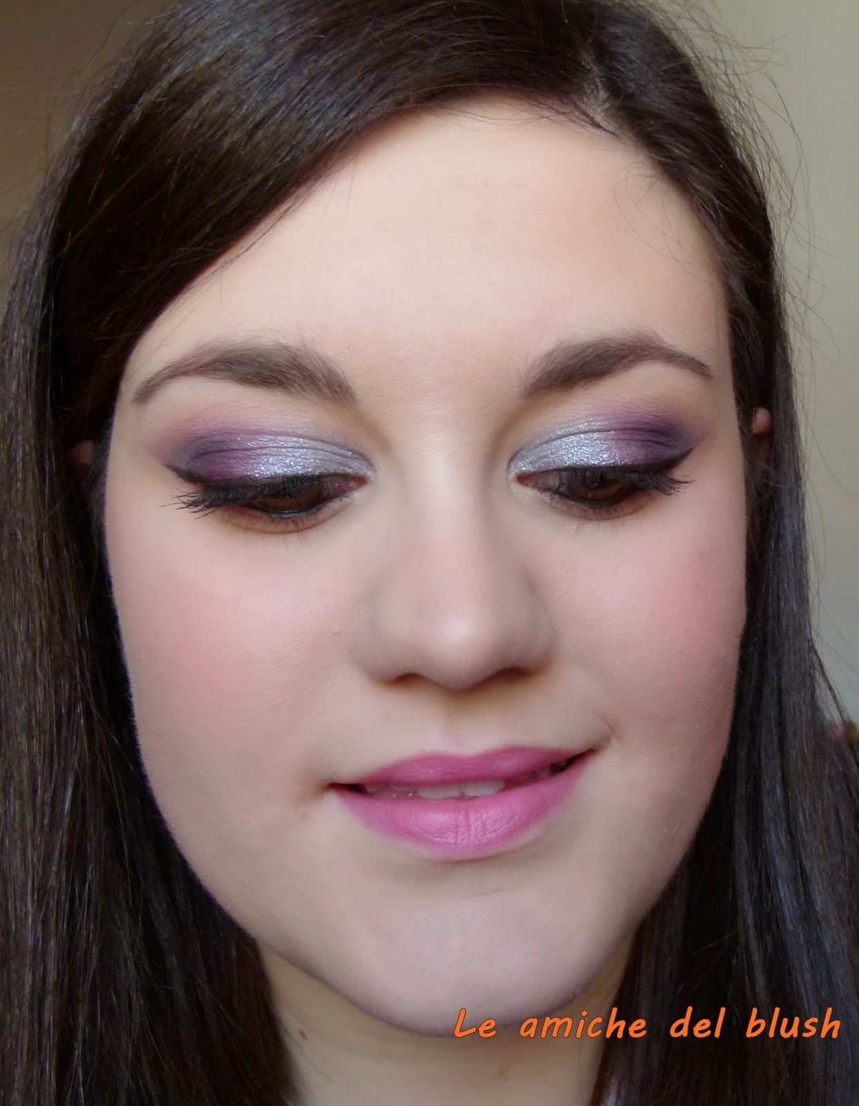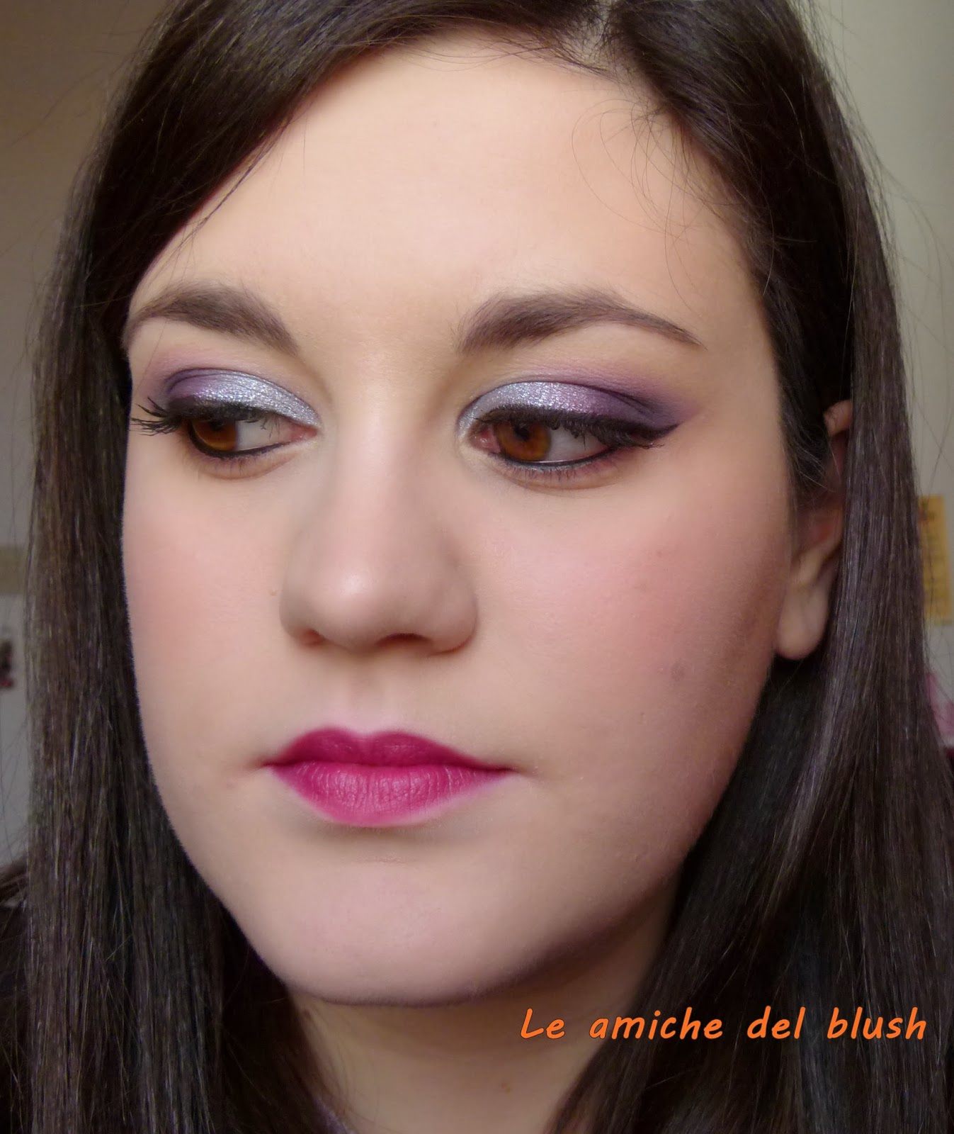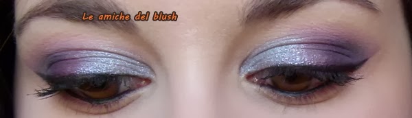 Per realizzare il trucco occhi ho usato come al solito il primer potion Urban Decay e poi nell\’angolo esterno ho steso un viola scurissimo dalla palettina Bad Girl di Sleek, passandoci sopra il viola e il fuchsia della Intensissimi di Neve Cosmetics. Nell\’angolo interno ho usato l\’ombretto in crema Vamp di Pupa num 301, un azzurro/grigio metallizzato. Ho steso una riga di eyeliner usando il lasting drama gel di Maybelline colore nero. Come mascara ho utilizzato il bellissimo Shock di Collistar, fa un effetto da paura! Infine nella rima interna ho usato la matita nera di Marc Jacobs (sample avuto in America).