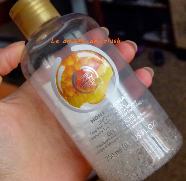 Si presenta in bottiglia trasparente, da 250 ml con tappo a scatto. Il miele utilizzato per questo prodotto e per gli altri della linea Honeymania, arriva dal commercio equo e solidale con l\’Etiopia. Il prodotto si presenta sotto forma di gel trasparente dal colore e dalla consistenza identici a quelli del miele vero e proprio. Il profumo merita tutto un capitolo a parte. L\’intera linea Honeymania di The Body shop presenta un profumo dolce e fruttato allo stesso tempo, per nulla stucchevole ed è proprio il profumo che mi ha fatta innamorare di questa linea. Il gel doccia trovo lavi benissimo la pelle, ne basta poco perchè fa subito schiuma. Dopo la doccia il profumo persiste sulla pelle, anche se non a lungo.