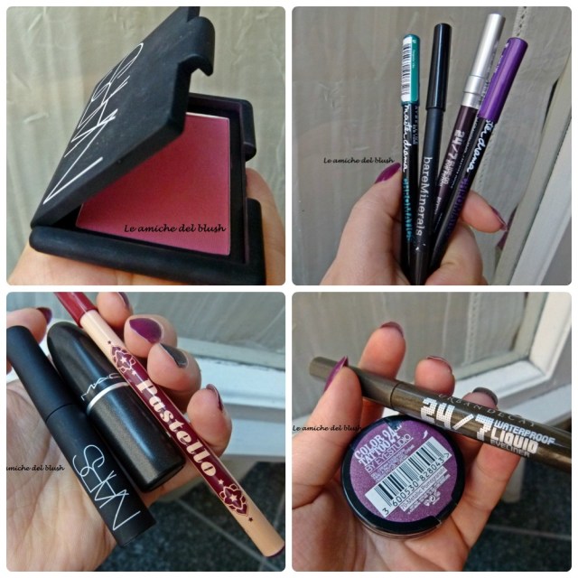 da sin: Mac Hot Tahiti, Nars Mascate, Vino Neve Cosmetics, Urban Decay Smog, Maybelline Purple Light, Maybelline Turquoise Vibe, Urban Decay Rockstar, Bare Minerals 8pm, Maybelline Metallic Pomegranate, Nars Amour.
