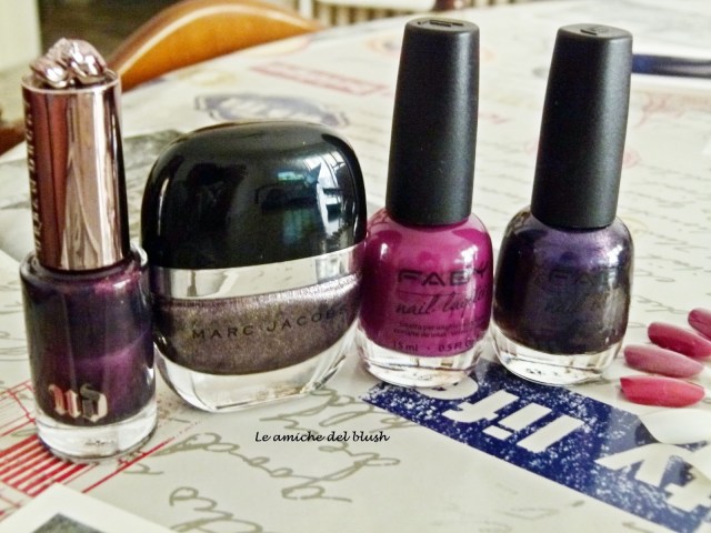 Anche i colori prugna e viola sono tra i miei preferiti in assoluto nella stagione autunnale. Da sin. Urban Decay – Vice | Marc Jacobs – Petra | Faby – The Magnificent | Faby – See you in Florence.