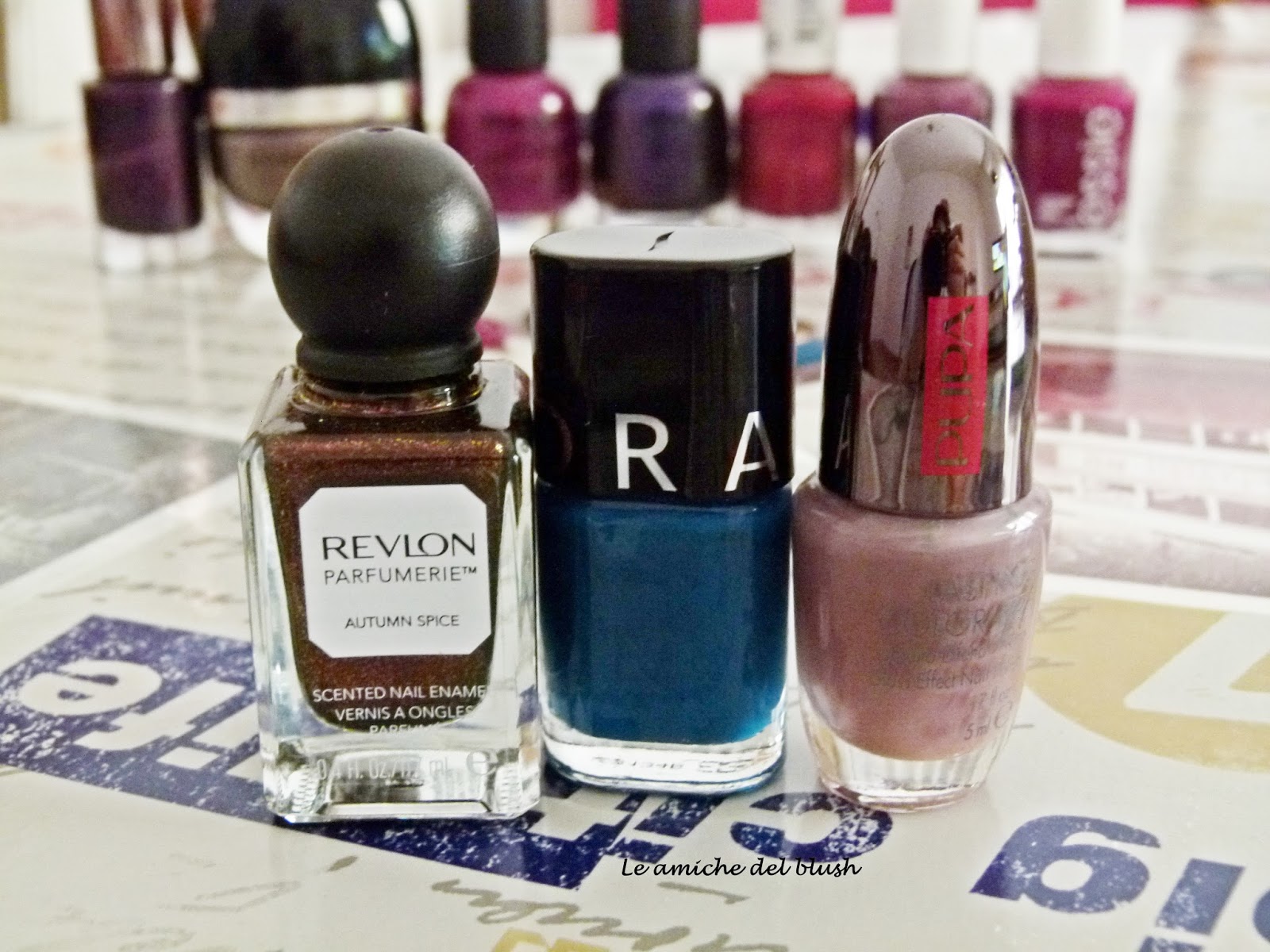 Nell\’ultimo gruppo ho voluto inserire colori misti, come i taupe, verde petrolio e marroni. Da sin. Revlon – Autumn Spice | Sephora – L61 | Pupa – 026