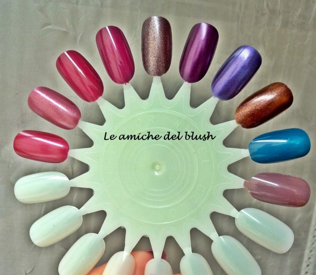 Il primo smalto è un viola caldo con perlescenza color arancio, bellissimo, ma necessita due passate. Il secondo è un viola/grigio freddissimo con pagliuzze dorate, coprente già alla prima passata, ma meglio farne due. Il terzo è un viola/fuchsia scuro senza glitter dal finish cremoso ed infine l\’ultimo è un viola freddo con perlescenza arancio che necessita di 3 o più passate per spiccare al meglio.