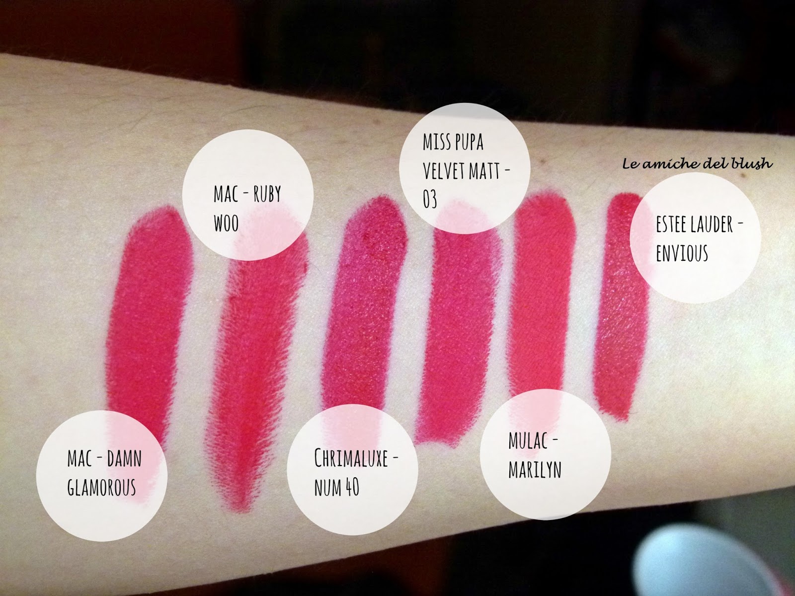 Ho selezionato rossi freddi e quasi tutti dal finish matte. A sinistra ho swatchato Damn Glamorous di Mac che è un matte rosso freddo. Di seguito troviamo sempre di Mac Ruby Woo, anche lui è dal finish matte, ma come molte di voi già sapranno è davvero secco e difficile da stendere, se non fosse che è stupendo una volta steso, a mio avviso rispetto a DG risulta con sottotono più caldo. Il rossetto successivo è il Chrimaluxe num 40 che mi è stato omaggiato dall\’azienda parecchio tempo fa. E\’ un rosso freddo, con sottotono blu, bellissimo e scorrevole sulle labbra. E\’ ancora in vendita, nel caso foste interessate potete trovarlo qui ——–> click.