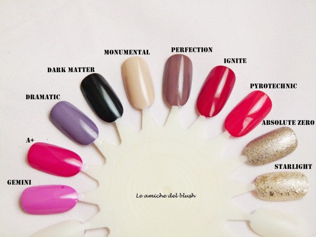 Gli 8 colori presenti sono tutti senza glitter e super lucidi, si va da un rosa ciclamino di Gemini, ad un fuchsia/rosso con A+; i due rossi sono Ignite piuttosto scuro e Pyrotechnic più brillante. Tra gli altri spicca Dramatic che è un grigio/lilla molto particolare, Dark Matter un nero liquirizia, Monumental un classico beige e Perfection un marroncino elegante. Infine i due top coat ad effetto che sono Absolute Zero un oro rosato con glitter che crea sull\’unghia una sorta di effetto \”sabbia\” e Starlight un topcoat composto da pagliuzze dorate con base trasparente.