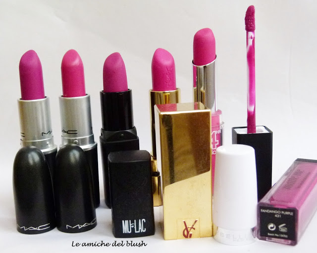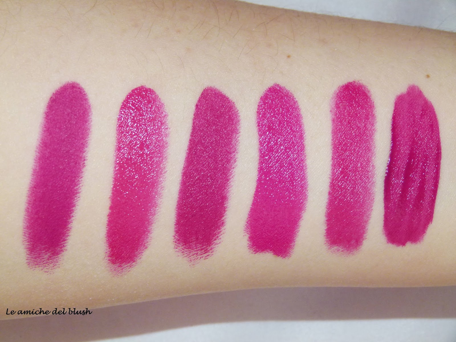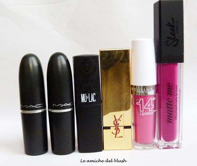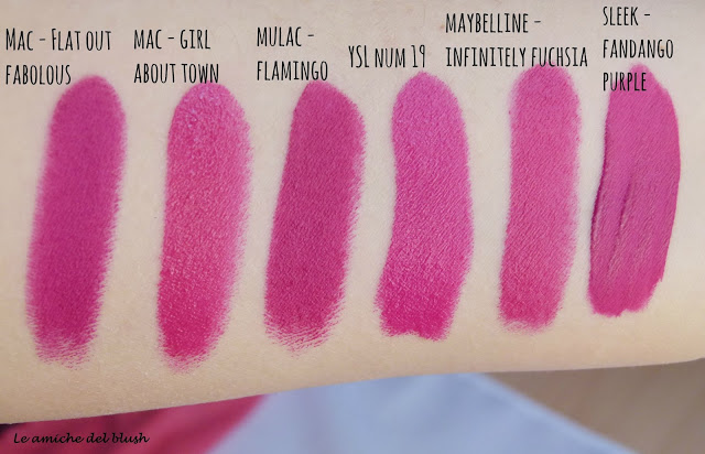Ho incluso da sinistra, Flat out Fabolous di Mac che è un retromatte, Girl About Town di Mac che è un amplified, Flamingo di Mulac che ha un finish pastello, il num 19 di YSL che ha un finish cremy, Infinitely Fuchsia di Maybelline che è un matte ed infine Fandango Purple di Sleek che è una tinta labbra completamente matte.