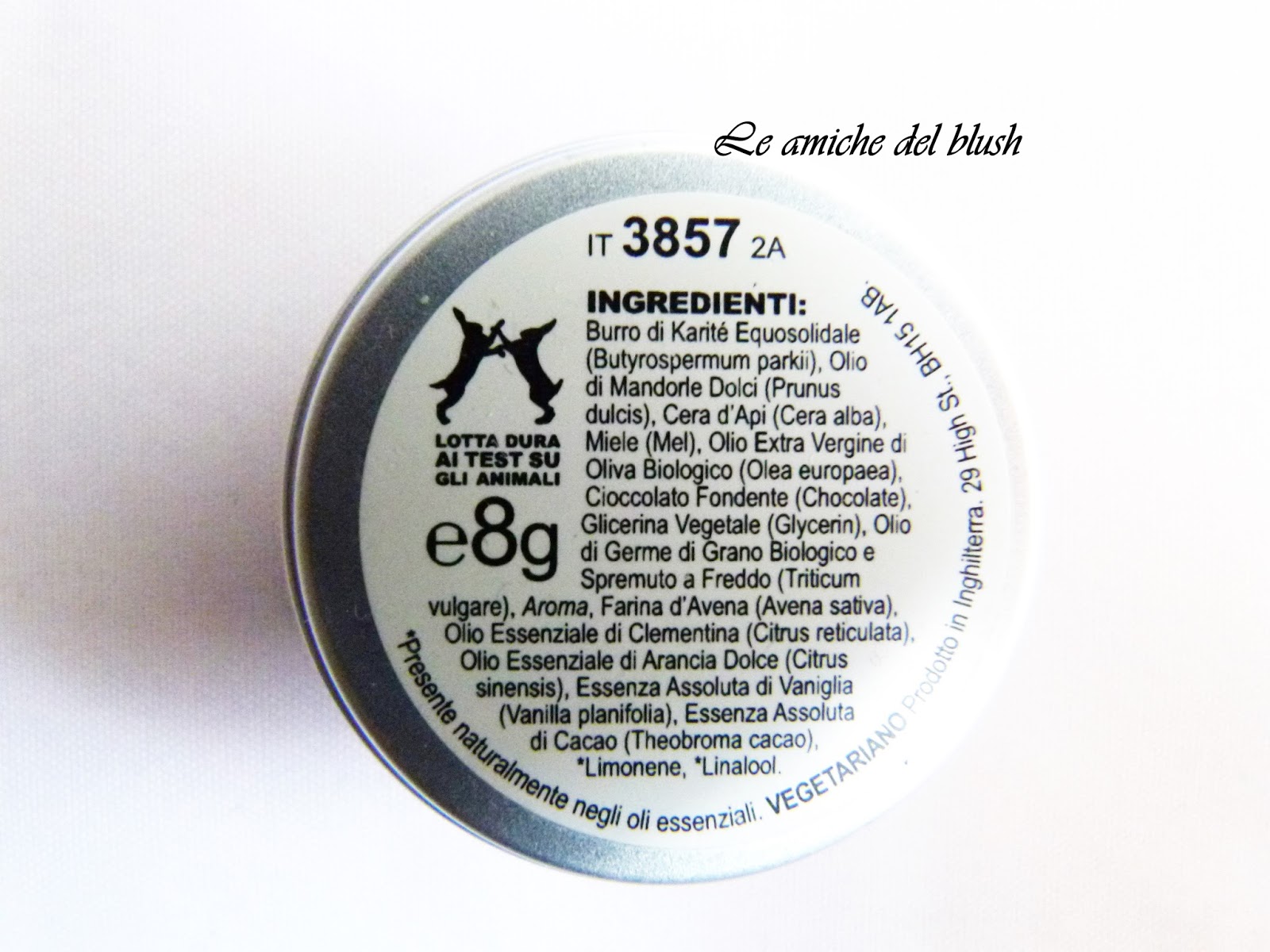 Questo balsamo che è prodotto in Inghilterra, è vegetariano e contiene olii essenziali, cioccolato (vero!), olio essenziale di arancia dolce e clementina, avena, cera d\’api e miele per nutrire a fondo le labbra. Ecco l\’INCI completo.