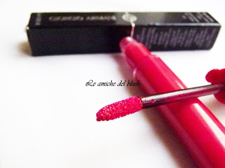 Si tratta di un rossetto liquido dal finish vellutato con l\’applicatore a spugnetta come quello dei gloss. E\’ contenuto all\’interno di una scatolina in cartone nero con scritte argento, mentre il packaging vero e proprio consiste in un tubetto in plastica trasparente con tappo rosso sul quale vi è una sorta di sigillo con le iniziali GA.