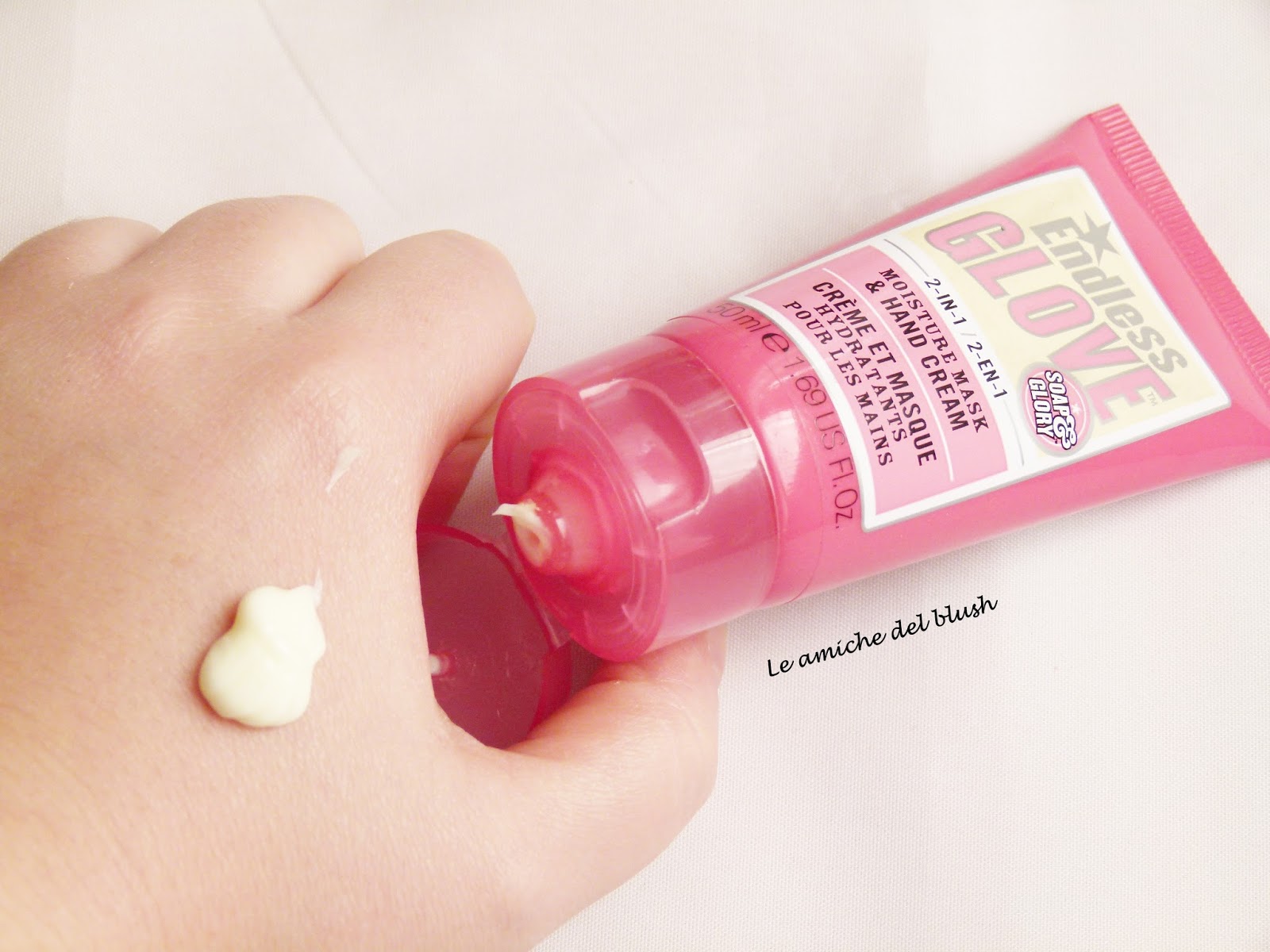 Il packaging è carinissimo, come del resto quello di tutti i prodotti Soap & Glory: un tubetto rosa con tappo a scatto e due etichette su fronte e retro con tutte le informazioni sul prodotto. Gli ingredienti che rendono questa crema così idratante ed efficace, sono un mix di burro di karitè, melograno, semi d\’uva e macadamia, che riescono a creare una barriera protettiva per le mani che dura fino a 12 ore. Si crea un vero e proprio \”guanto infinito\” (endless glove), che protegge e ripara a lungo le mani. Il profumo di questa crema è spiccatamente di menta piperita, che aiuta la rimozione di eventuali odori sgradevoli dalle mani.