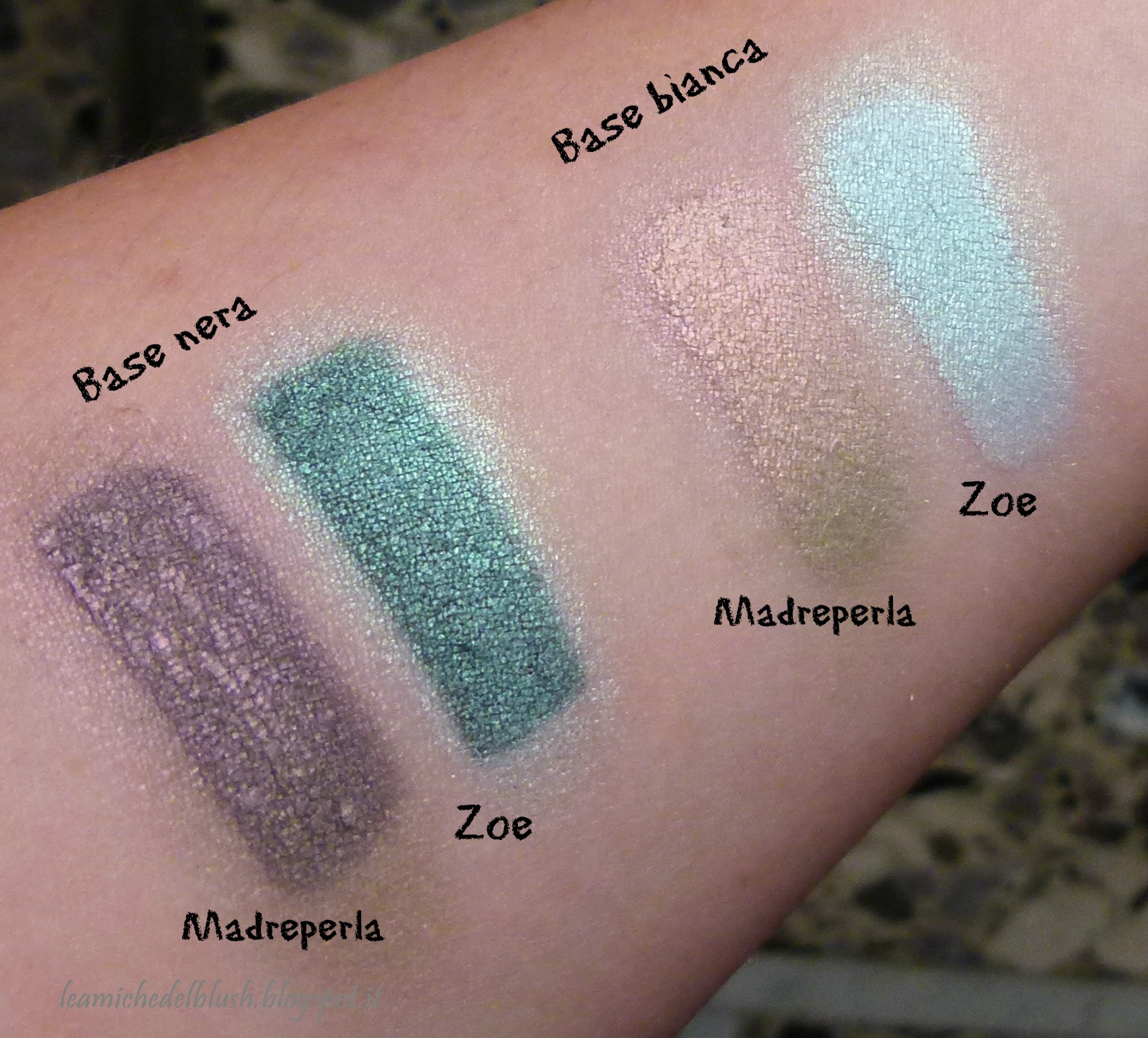 Nella foto che segue vi mostro come cambiano i riflessi degli ombretti Duochrome su base nera e bianca; diventano molto particolari e sono perfetti per dare carattere al makeup, da usare come punti luce e da stratificare anche su altri ombretti. Io preferisco Zoe su base nera, mentre Madreperla su base bianca.