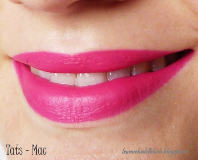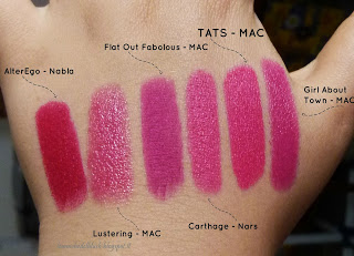 Nella foto che segue ho confrontato Tats con altri rossetti fuchsia di MAC, Nars e Nabla. E\’ un colore davvero diverso che non assomiglia a nessun rossetto fuchsia in mio possesso! Non posso che essere stra felice per l\’acquisto.
