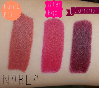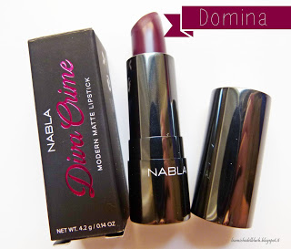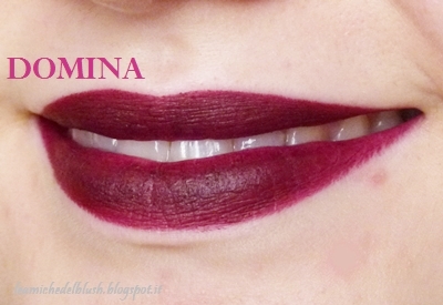 Domina viene descritto dal sito Nabla come un color prugna scuro dal sottotono rosso. Sulle labbra è parecchio scuro, ma risulta abbastanza uniforme. E\’ un colore che meditavo di provare da tempo, devo ancora capire se mi stia bene o meno, però mi piace un sacco.