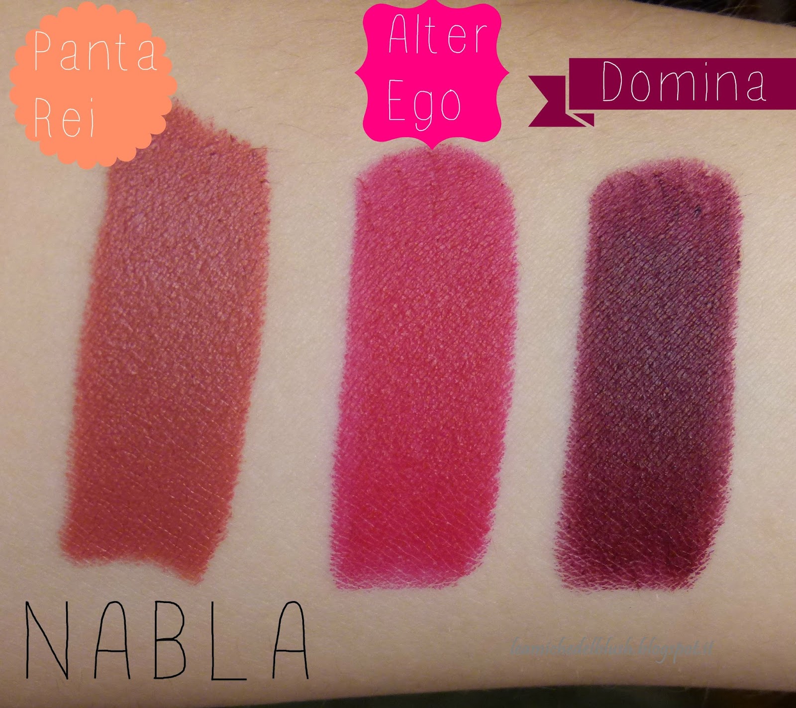 Ecco ora gli swatches dei tre rossetti Diva Crime sul braccio: Panta Rei è parecchio falsato rispetto allo swatches sulle labbra, mentre Alter Ego e Domina sono fedeli.