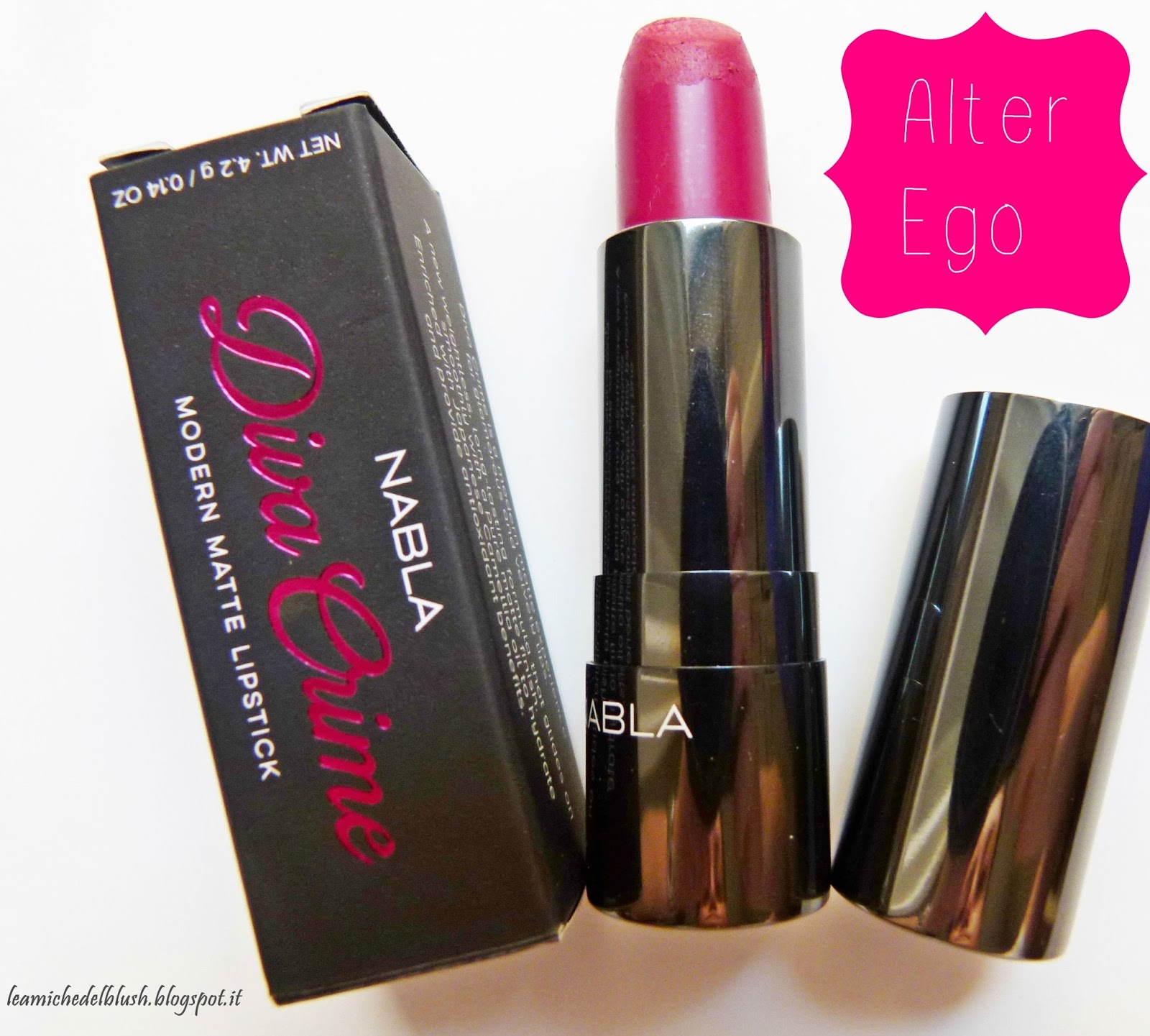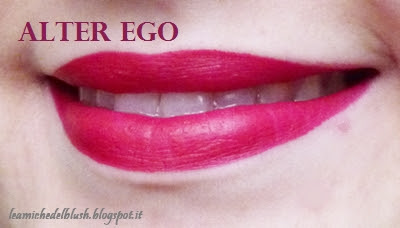 Alter Ego viene descritto dal sito Nabla come un fuchsia-amaranto scuro.Sulle mie labbra risulta un fuchsia scuro con base rossa. E\’ bellissimo e molto particolare, lo abbino di solito con una linea di eyeliner sugli occhi e trovo che illumini davvero tanto il viso.