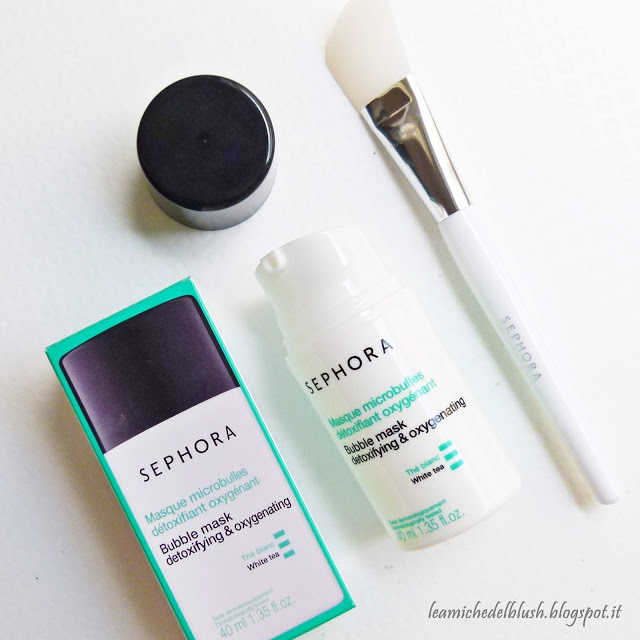 La Bubble Mask agisce sul colorito spento poichè contiene delle \”microbolle detossificanti\” che a contatto con l\’aria si trasformano in una mousse in grado di eliminare tutte le impurità. Contiene tè bianco e vitamina E. Va tenuta in posa il tempo necessario a far si che si trasformi in mousse e poi rimossa con un dischetto di cotone o sciacquata. Ideale per tutti i tipi di pelle.