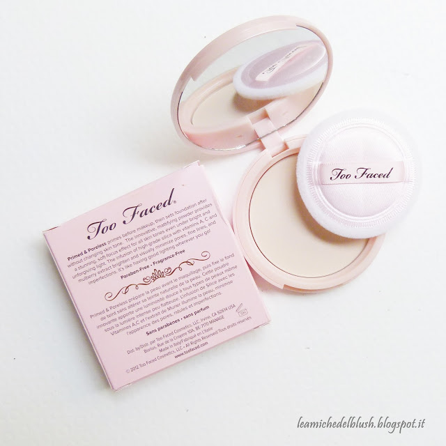Oggi vi parlo invece di una nuova cipria che sto provando da prima del periodo estivo e che ho acquistato nella versione polvere libera e compatta: Too Faced Primed & Poreless Powder.