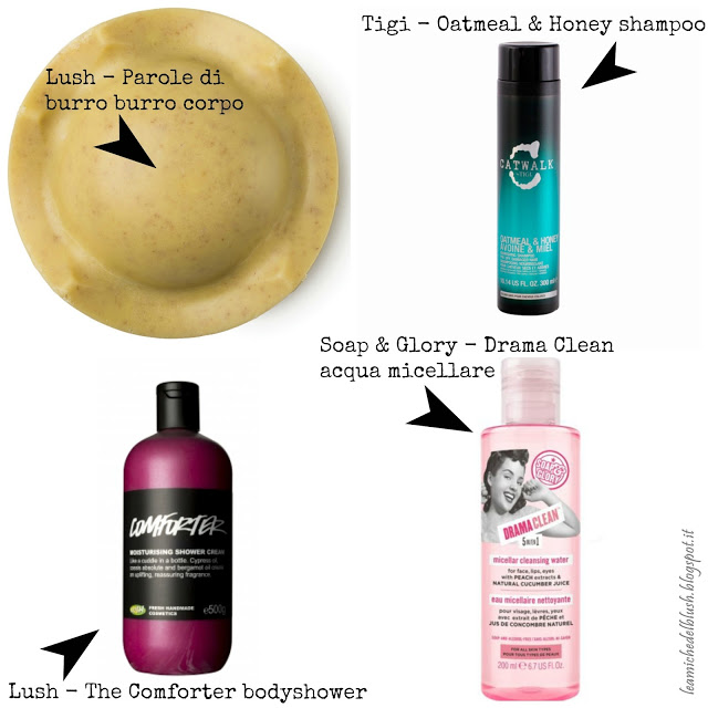 Oggi nuovo post sul blog e si parla di prodotti che ho terminato nell\’ultimo periodo, in particolare uno shampoo per capelli secchi che è stato fondamentale in estate, l\’acqua micellare che ormai uso abitualmente come struccante viso, il nuovo bagnoschiuma Lush \”The Comforter\” e il burro corpo \”Parole di burro\” sempre di Lush, che volevo provare da una vita. Pronti? Via!