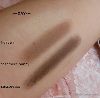 I colori sono tutti estremamente scriventi e la consistenza è \”burrosa\” vellutata e quasi per nulla polverosa. Sulla palpebra sono ben visibili soprattutto se applicati con un primer sotto (il mio preferito è Primer Potion UD), resistono benissimo per tutta la giornata! Non posso assicurarvi la tenuta senza primer, perchè con la mia palpebra oleosa sarebbe un\’utopia.