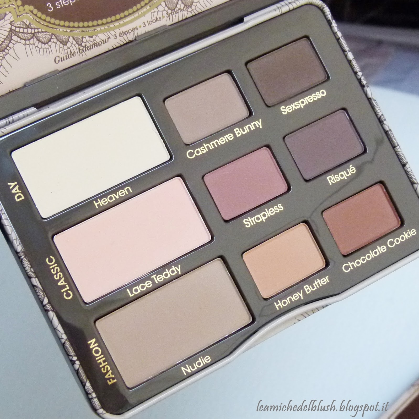 Il packaging è una scatolina rettangolare in latta con un pattern in pizzo, molto elegante e chiusura calamitata; è bella resistente così da non correre il rischio di frantumare gli ombretti. All\’interno contiene uno specchio, una guida per ricreare 3 makeup e 9 cialde. La disposizione dei colori non è casuale: divisi per righe orizzontali troviamo i tre ombretti perfetti per ricreare un look da giorno, classico oppure fashion. La palette nel complesso è molto piccola e compatta perfetta da portare in viaggio o in borsa.