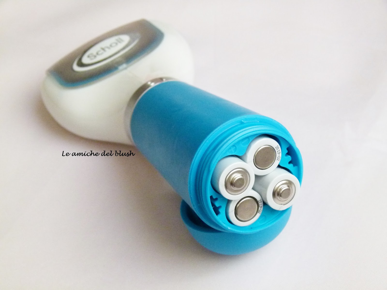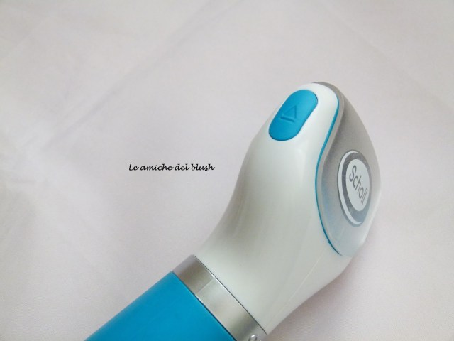 Il Velvet Soft si presenta con una forma ergonomica (molto simile a quella del pela patate, per intenderci!) nei colori azzurro e bianco che caratterizzano un pò tutto il marchio. L\’impugnatura è in materiale antiscivolo e presenta nella parte inferiore il vano dove andranno inserite le pile per il funzionamento (sono già incluse nella confezione). Al centro vi è la rotella da far scorrere e posizionare su \”I\” quando vorrete accendere lo strumento. Nella parte superiore, protetta da un coperchietto trasparente con il simbolo del marchio Scholl, vi è la testina in Microlumina, un materiale \”scrubbante\”, pensato appositamente per ridurre tutte le callosità, la secchezza e le screpolature che spesso sono solite formarsi sul piede, soprattutto nella zona dei talloni. Nella parte laterale vi è un tastino azzurro che serve per smontare la testina e sostituirla.
