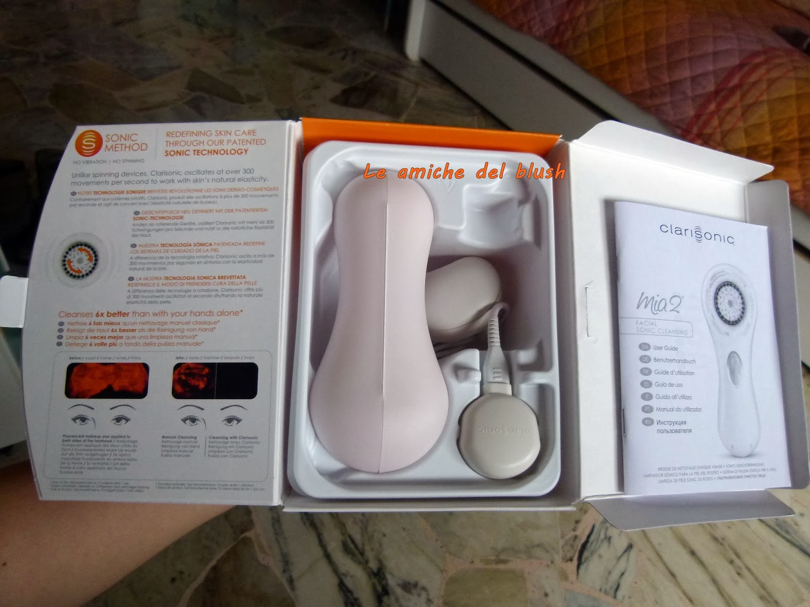 Una volta aperta la scatola, ecco come si presenta. Contiene il Clarisonic Mia2 con la custodia da viaggio, il caricabatterie magnetico e un sample di detergente viso, oltre che il libretto di istruzioni.
